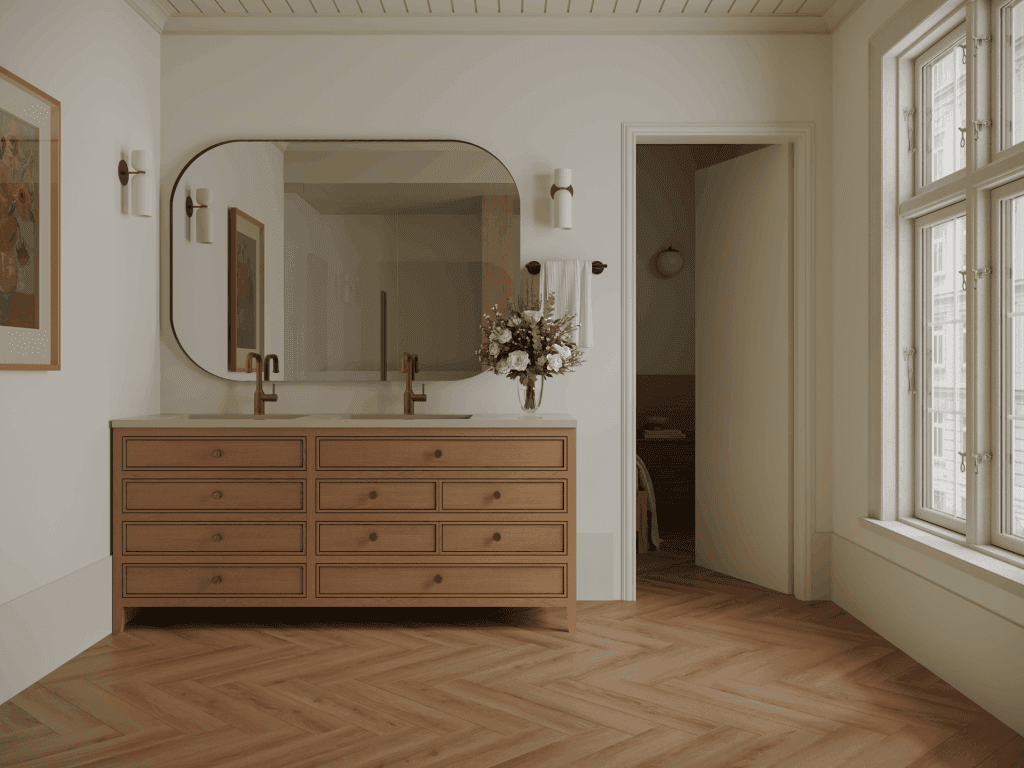 NORLAND PARQUET S 1055-4 Lama привлекает внимание своим глубоким темно-ореховым оттенком, наполняющим помещение атмосферой роскоши и спокойствия. Полуматовая поверхность мягко выделяет уникальную структуру дерева, добавляя пространству особую изящность. Идеально подобранное тиснение создает безупречный переход между элементами, подходящее для любого современного интерьера.